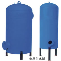 負壓引水罐,俗稱真空引水罐,用于非吸程供水泵(水源低于泵進水口的場所)。消防系統建議用自灌式,如無條件實現自灌式,消防規范規定必須有可靠的引水裝置,即負壓引水罐,用于抽吸地下水,河塘,湖泊,取水口等自然水,罐相附加自來水一般采用DN25管進水,只需一次灌水,終身使用,原理是當啟動消防主泵開始工作,罐內水位下降,灌頂部形成真壓(負壓),當罐內水位下降至罐體60%時,灌頂形成一定真空,自然水源即源源不斷地被吸出。
